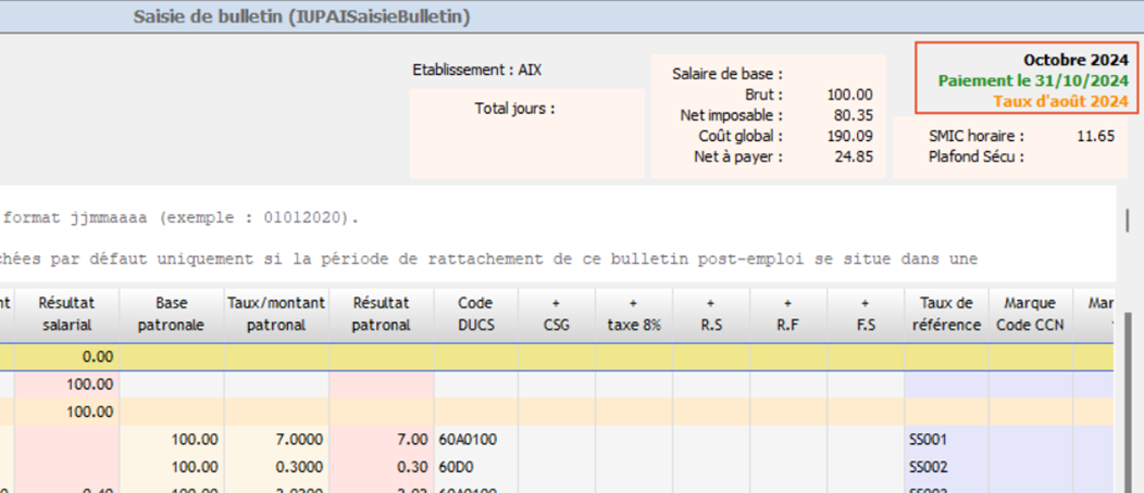 Par défaut, le bulletin post-emploi est rattaché au dernier emploi. Ainsi, les taux ainsi que les cumuls correspondent à la période de rattachement du bulletin, comme indiqué en haut à droite :