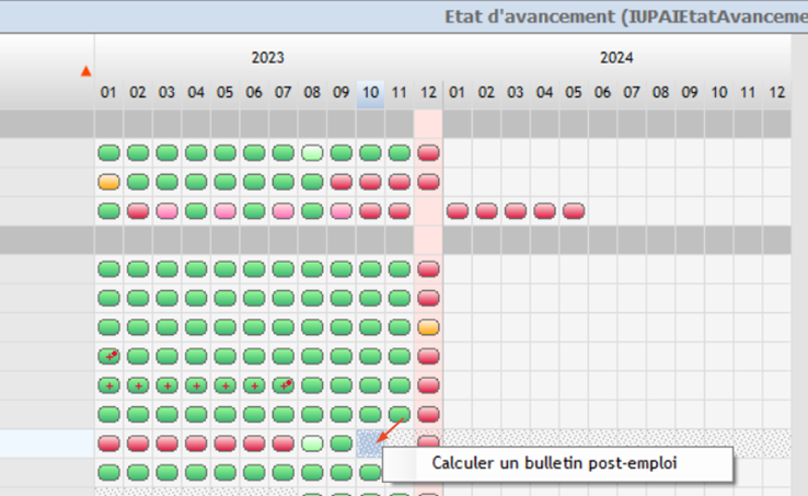 Depuis l'État d'avancement, réaliser un clic droit sur la case grisée correspondant au mois de génération du bulletin complémentaire pour le salarié concerné et sélectionner "Calculer un bulletin post-emploi" :