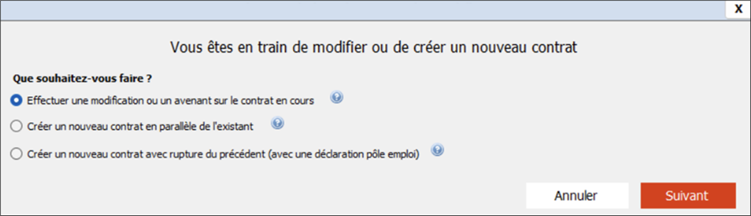 Dans la fenêtre qui s'ouvre, sélectionner "Effectuer une modification ou un avenant sur le contrat en cours" :