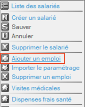 Dans la fiche Salarié, cliquer sur "Ajouter un emploi" dans le volet de droite pour créer un nouvel emploi :